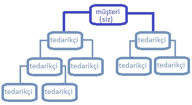 Kompleks bir tedarik zinciri olan yandaki strateji kabul edelim ki her sektöre uymayabilir. Satınalma yaptığınız firmaların tedarikçilerini de yönetme ve yönlendirmeyi içeren strateji daha çok perakende, otomotiv gibi sektörlerde uygulanır.